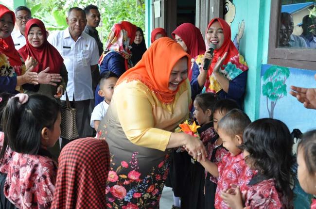 Keterangan Gambar : Bunda PAUD Bengkalis Kasmarni Amril menyapa anak - anak TK.