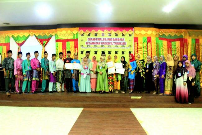 Keterangan Gambar : Panitia Pelaksana foto bersama dengan Dewan Juri dan Finalis Bujang Dara Siak Kecil Tahun 2017