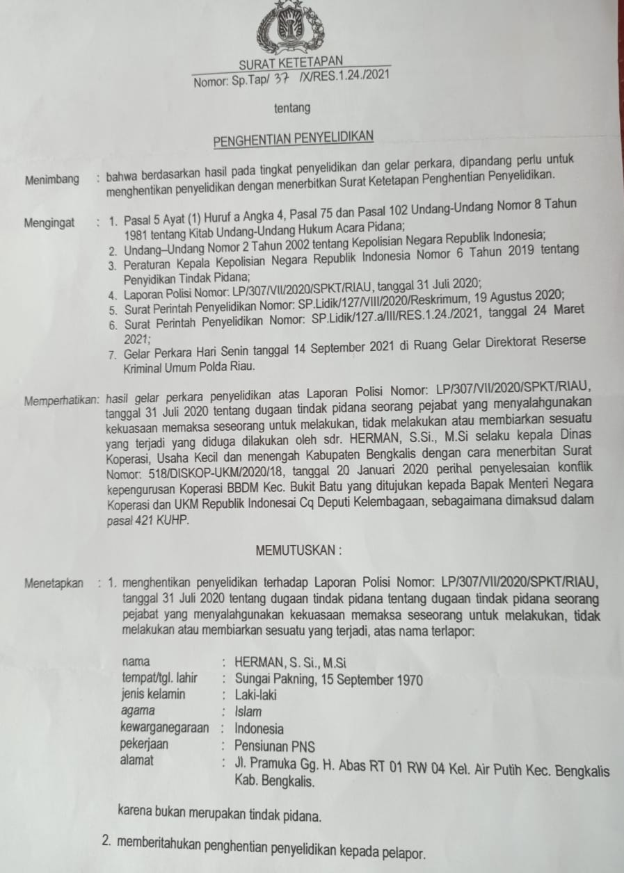 Penghentian surat penyelidikan tersebut tertuang dalam Surat Ketetapan Polda Riau bernomor Sp.Tap/ 37 / X/RES.1.24./2021 tentang Penghentian Penyelidikan, ditanda tangani oleh Direktur Reserse Kriminal Umum Polda Riau, KOMBES Teddy Ristiawan, S.H, S.I.K, MH.