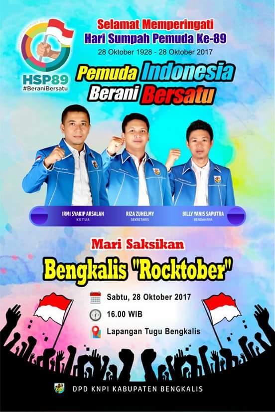 Disampaikan Ketua KNPI Bengkalis, Irmi Syakib Arsalan, Jumat (27/10/2017), kegiatan ini digelar dalam rangka memperingati Hari Sumpah Pemuda yang ke-89. Selain itu juga sebagai wadahamerangkul musisi-musisi Bengkalis yang sempat vakum. “Bengkalis Roctober Harmoni untuk Negeri" merupakan kegiatan ketiga dilaksanakan. Dimana sebelumnya digelar “Bengkalis Street Jam I dan IIâ€. Acara ini merupakan partisipasi para musisi-musisi Bengkalis, tanpa sponsor.