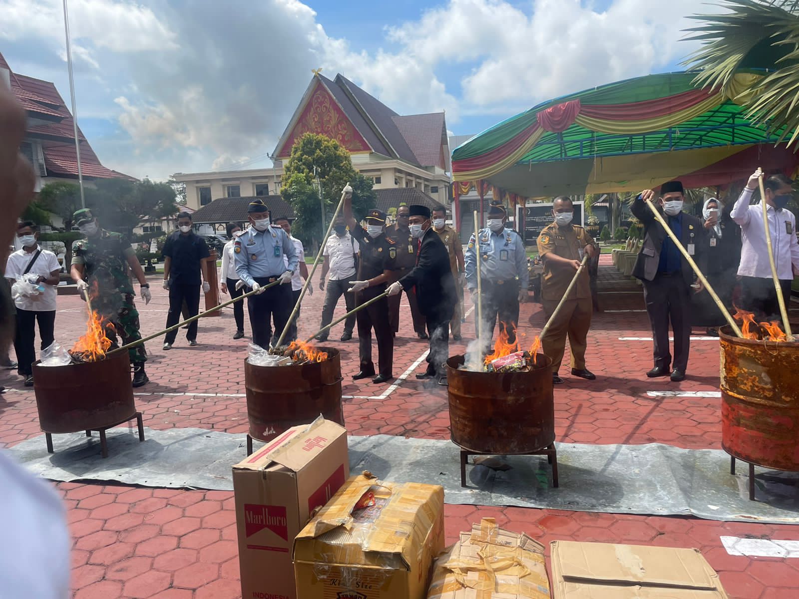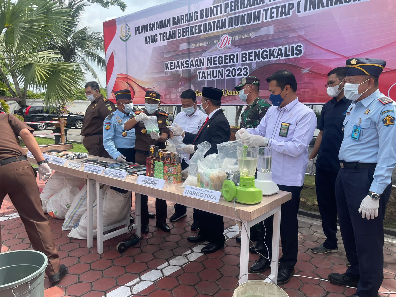 BENGKALIS - Kejaksaan Negeri (Kejari) Bengkalis menggelar pemusnahan barang bukti hasil sitaan perkara tindak pidana yang telah mempunyai kekuatan hukum, Senin 9 Januari 2023.