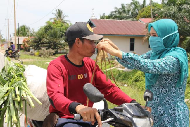 BANDARLAKSAMANA - Untuk memerangi dan memutus mata rantai penyebaran Coronavirus Desiese 2019 (Covid - 19), Ketua TP PKK Kecamatan Bandar Laksamana Kabupaten Bengkalis Diana Rita Harap, M.Pd memimpin pembagian masker gratis untuk masyarakat di wilayah itu.