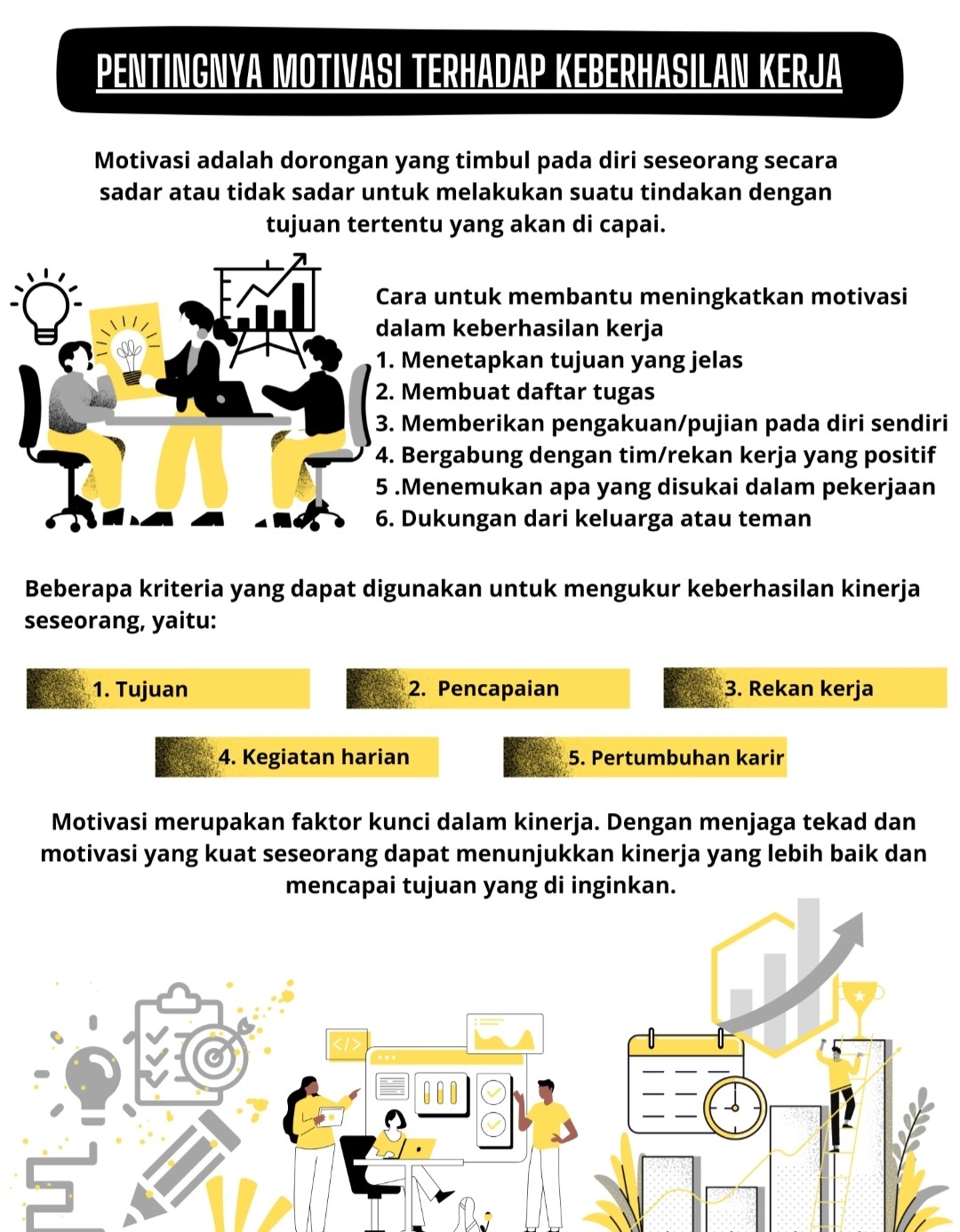 Untuk mencapai hasil yang mengesankan, motivasi merupakan factor kunci dalam kinerja. Dengan menjaga tekad dan motivasi yang kuat seseorang dapat menunjukkan kinerja yang lebih baik dan mencapai tujuan yang diinginkan. Ada beberapa kriteria yang dapat digunakan untuk mengukur keberhasilan kinerja seseorang. Diantaranya adalah sebagai berikut: