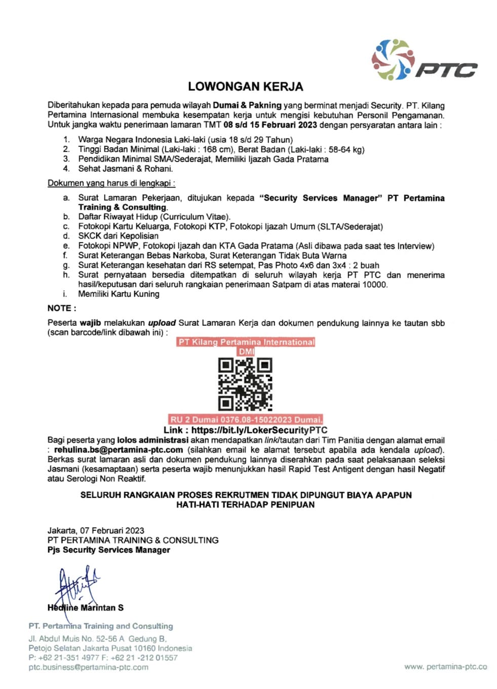 SUNGAIPAKNING - PT Pertamina Training and Consulting (PTC) membuka lowongan kerja bagi tenaga sekuriti, yang akan ditempatkan di PT. Kilang Pertamina Internasional (KPI) Sungai Pakning dan Dumai, penerimaan berkas lamaran dibuka dari tanggal 8 sampai dengan 15 Februari 2023.