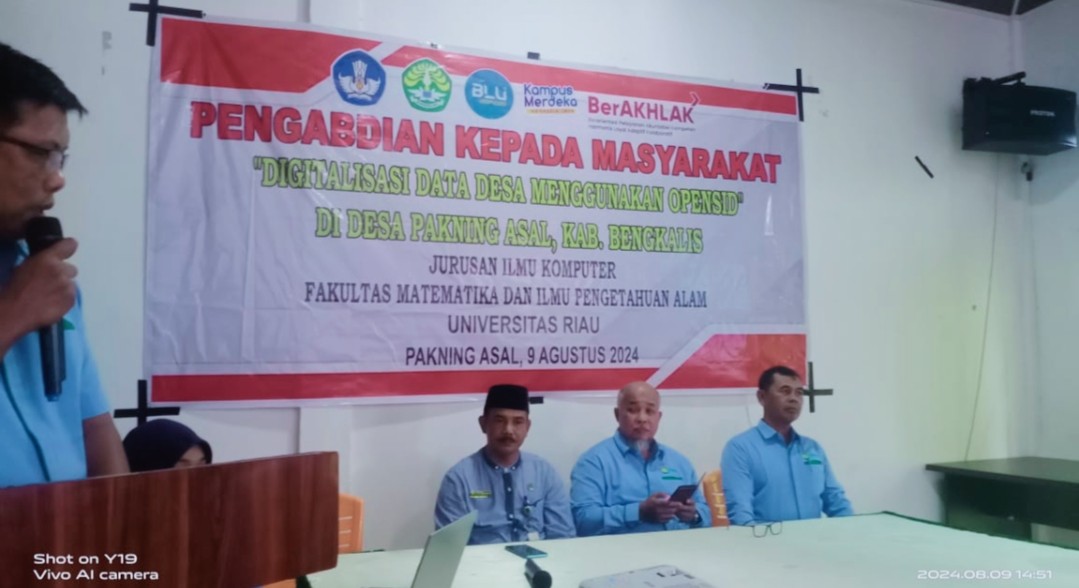 Kepala Desa Pakning Asal Mafri Okber mewakili pemerintah Desa Pakning Asal dalam sambutannya mengucapkan terimakasih kepada Pemerintah Kabupaten Bengkalis yang telah menjalin kerjasama dengan Mahasiswa KUKERTA Universitas Riau dalam Sosialisasi dan pelatihan dasar penggunaan website online desa OpenSID.