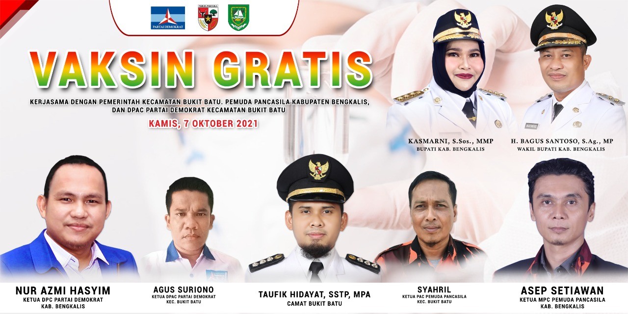 Sementara itu Camat Bukit Batu Taufik Hidayat mengatakan atas nama pemerintah kabupaten Bengkalis khususnya kecamatan Bukit Batu mengucapkan terima kasih kepada DPC Partai Demokrat dan MPC Pemuda Pancasila kabupaten Bengkalis beserta jajarannya atas terlaksana vaksinasi gtatis di kecamatan Bukit Batu.