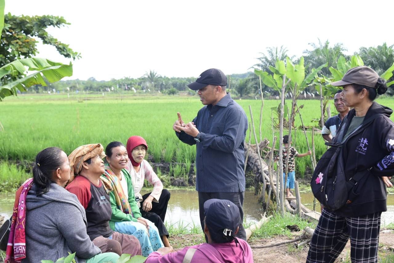 Keterangan Gambar : Dr. Bagus Santoso Calon Wakil Bupati Bengkalis saat berbincang dengan petani padi Desa Harapan Baru