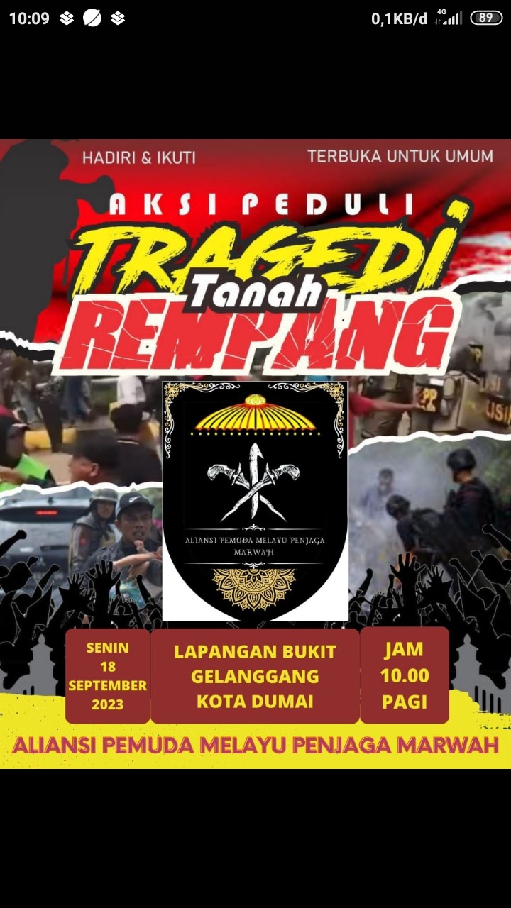 Dumai – Aliansi Masyarakat Melayu Dumai Peduli Rempang dan Galang berencana akan melakukan aksi demo di kota Dumai, titik kumpul di taman Bukit Gelanggang Kota Dumai Senin Tanggal 18 September 2023.