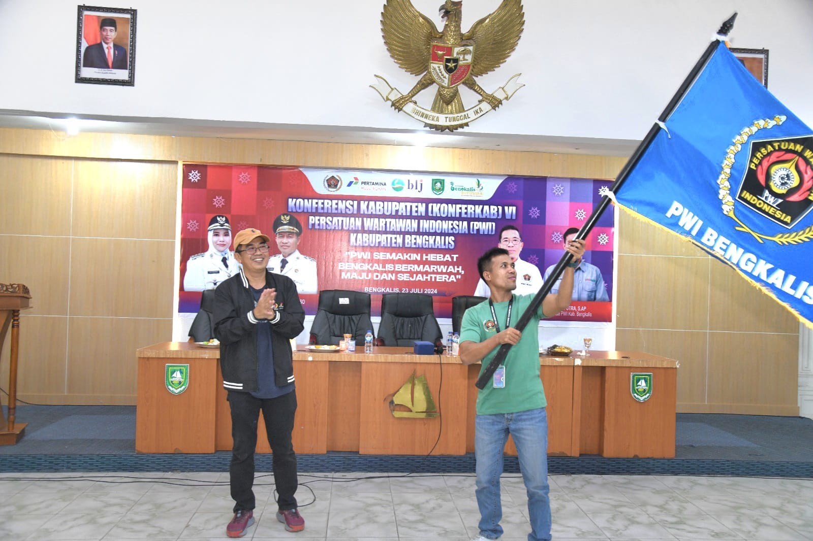Keterangan Gambar : Adi Putra Ketua PWI Bengkalis Terpilih periode 2024 - 2027 saat menerima bendera petaka dari Ketua PWI Riau Raja Isyam