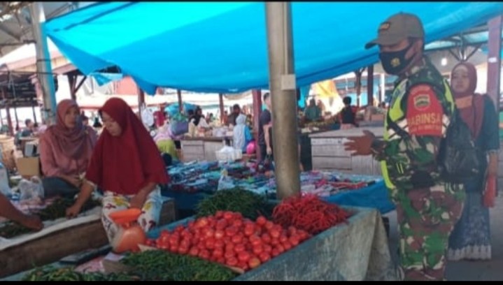 BUKIT BATU- Babinsa Koramil 07/Bukit Batu Kabupaten Bengkalis melaksanakan sosialisasi terkait tentang wabah Covid-19 di pasar baru Sungai pakning Kecamatan Bukit Batu Pukul, 08:00 WIB, Kamis(17/06/2021).