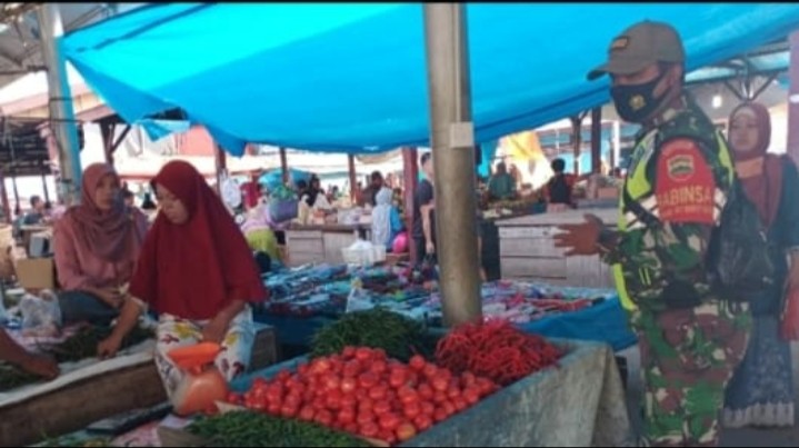 BUKIT BATU-Babinsa Koramil 07/Bukit Batu Kabupaten Bengkalis melaksanakan sosialisasi terkait tentang wabah Covid-19 di pasar baru Sungai pakning Kecamatan Bukit Batu Pukul, 08:00 WIB,Selasa(08/06/2021).