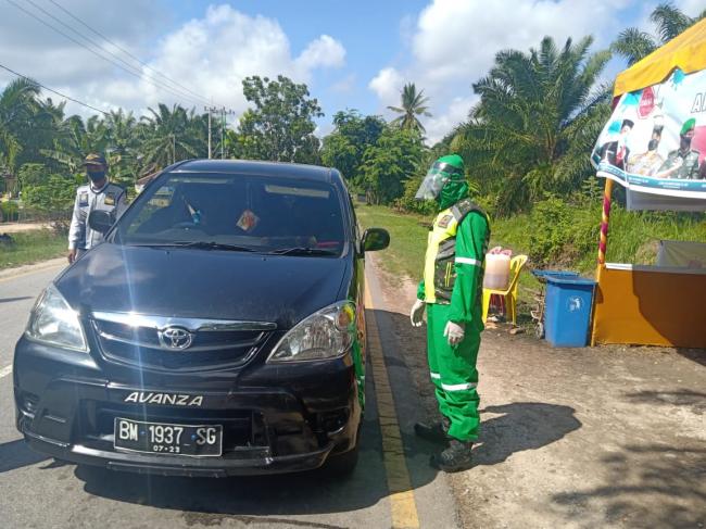 SIAK KECIL- Babinsa Koramil 07/ Bukit Batu Kabupaten Bengkalis melakukan PAM Posko guna pemeriksaan suhu tubuh di perbatasan Desa Sungai Siput Kecamatan Siak Kecil dan Sabak Auh, Selasa (02/06/2020).