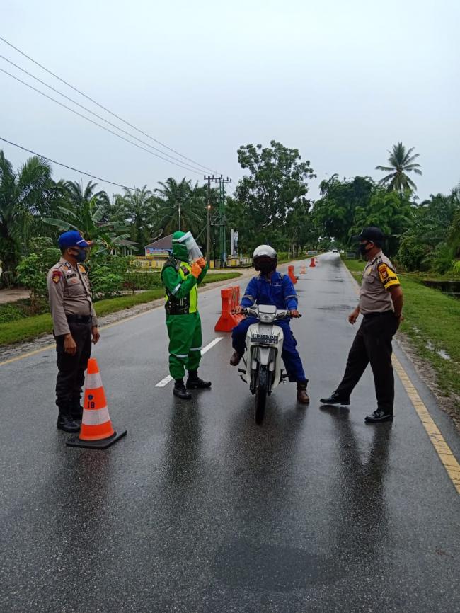 SIAK KECIL- Babinsa Koramil 07/ Bukit Batu Kabupaten Bengkalis melakukan pemeriksaan suhu tubuh di perbatasan Desa Sungai Siput Kecamatan Siak Kecil dan Sabak Auh, Kamis (21/05/2020).