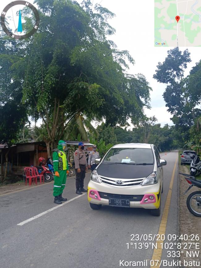 SIAK KECIL-Â Babinsa Koramil 07/ Bukit Batu Kabupaten Bengkalis melakukan PAM Posko guna pemeriksaan suhu tubuh di perbatasan Desa Sungai Siput Kecamatan Siak Kecil dan Sabak Auh, Minggu (24/05/2020).