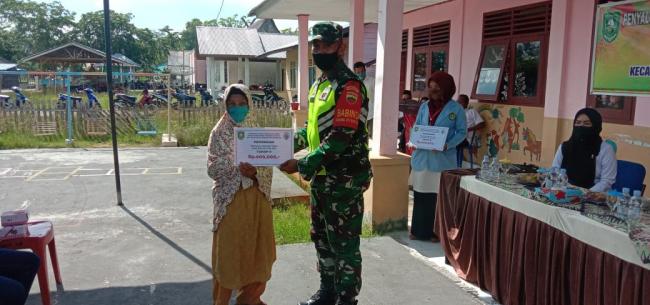 BUKIT BATU-Â Babinsa Koramil 07/Bukit Batu Kabupaten Bengkalis ikut mengawasi penyaluran Dana Bantuan Langsung Tunai Dana Desa (BLT DD) dari Kementerian Desa (Kemendes), untuk masyarakat yang terdampak Covid-19 di Desa Pangkalan Jambi Kecamatan Bukit Batu Sabtu (06/06/2020).