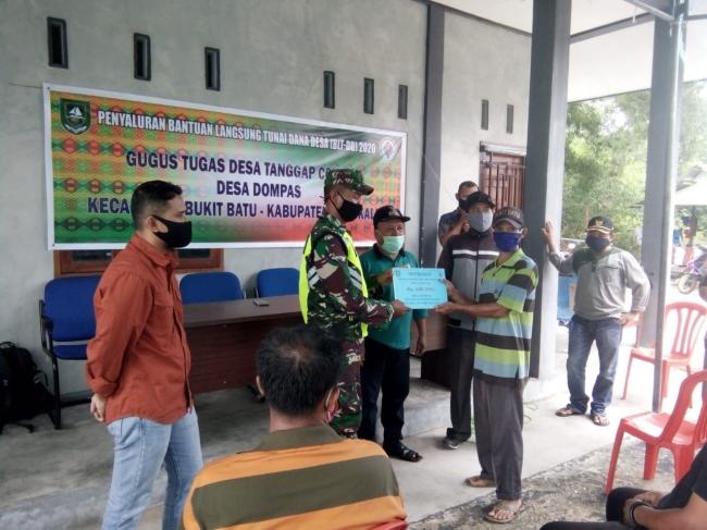 BUKIT BATU- Babinsa Koramil 07/Bukit Batu Kabupaten Bengkalis mengawasi penyaluran Dana Bantuan Langsung Tunai Dana Desa (BLT DD) dari Kementerian Desa (Kemendes), untuk masyarakat yang terdampak Covid-19 di Desa Dompas Kecamatan Bukit Batu, Jum'at (22/05/2020).