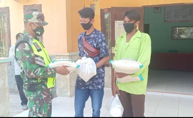SIAK KECIL- Babinsa Koramil 07/Bukit Batu Kabupaten Bengkalis mengawal dan mengawasi pendistribusian bantuan sembako murah dari Disperindag Kabupaten Bengkalis di peruntukkan bagi masyarakat yang terdampak Covid-19 di Desa Sungai Nibung Kecamatan Siak Kecil, Minggu (17/05/2020).
