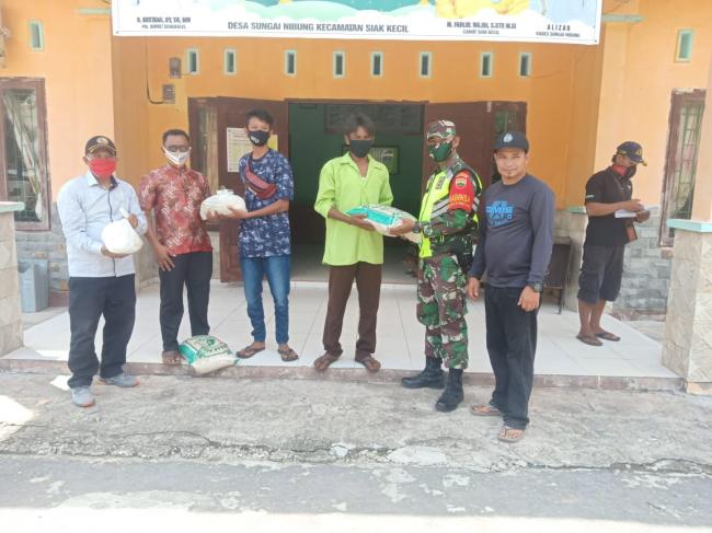 SIAK KECIL- Babinsa Koramil 07/Bukit Batu Kabupaten Bengkalis mengawal dan mengawasi pendistribusian bantuan sembako murah dari Disperindag Kabupaten Bengkalis di peruntukkan bagi masyarakat yang terdampak Covid-19 di Desa Sungai Nibung Kecamatan Siak Kecil, Minggu (17/05/2020).
