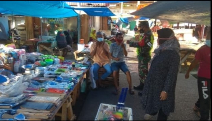 BUKIT BATU- Babinsa Koramil 07/Bukit Batu Kabupaten Bengkalis melaksanakan sosialisasi terkait tentang wabah Covid-19 di pasar baru Sungai pakning Kecamatan Bukit Batu Pukul, 08:00 WIB,Selasa(29/06/2021).