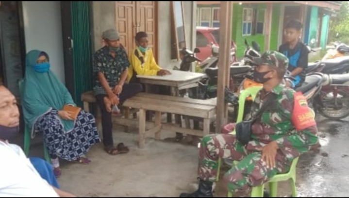 BUKIT BATU-Babinsa Koramil 07/Bukit Batu Kabupaten Bengkalis melaksanakan sosialisasi terkait tentang wabah Covid-19 di Pangkalan Jambi Kecamatam Bukit Batu Pukul, 08:00 WIB,Sabtu (27/03/2021).