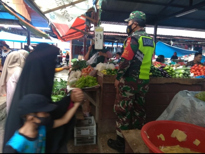 BUKIT BATU- Babinsa Koramil 07/Bukit Batu Kabupaten Bengkalis melaksanakan sosialisasi terkait tentang wabah Covid-19 di pasar baru Sungai pakning Kecamatan Bukit Batu Pukul, 08:00 WIB Rabu (25/08/2021).