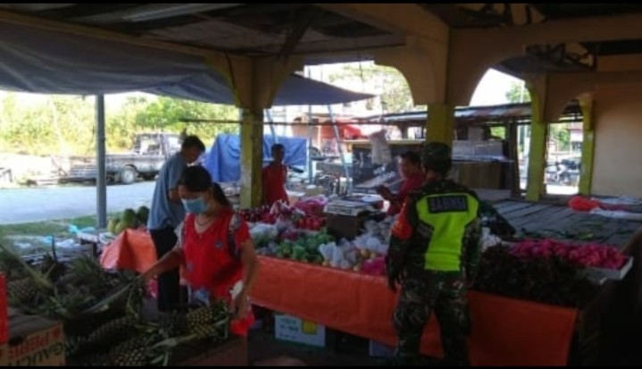 BUKIT BATU-Babinsa Koramil 07/Bukit Batu Kabupaten Bengkalis melaksanakan sosialisasi terkait tentang wabah Covid-19 di pasar baru Sungai pakning Kecamatan Bukit Batu Pukul, 08:00 WIB,Jumat (09/04/2021).