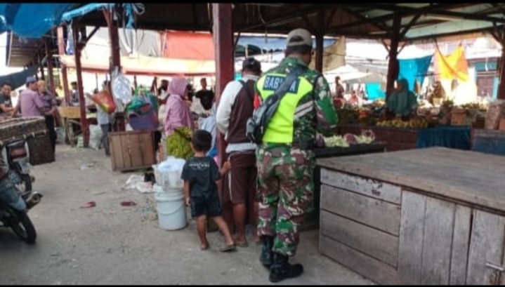 BUKIT BATU-Babinsa Koramil 07/Bukit Batu Kabupaten Bengkalis melaksanakan sosialisasi terkait tentang wabah Covid-19 di pasar baru Sungai pakning Kecamatan Bukit Batu Pukul, 08:00 WIB Selasa (30/03/2021).