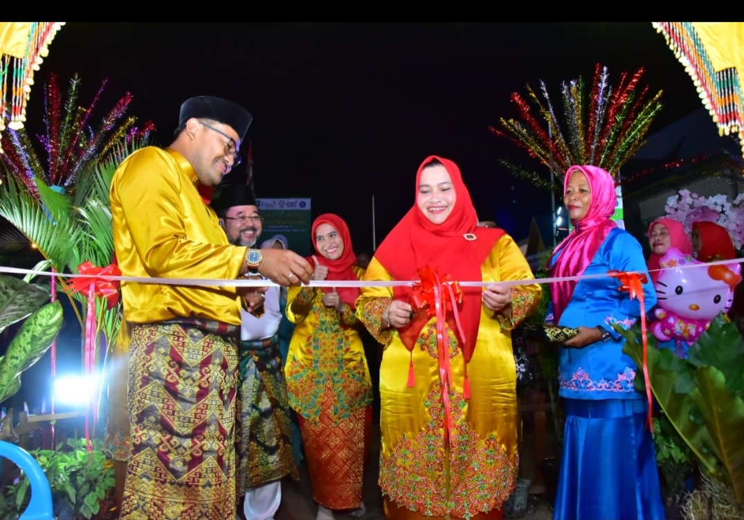Keterangan Gambar : Bupati Bengkalis Kasmrni, Camat Bukit Batu, Ketua TP PKK Bukit Batu, Manager Pertamina RU II Sungai Pakning, Kepala Desa Pakning Asal dan Istri foto bersama di depan Bazar Desa Pakning Asal