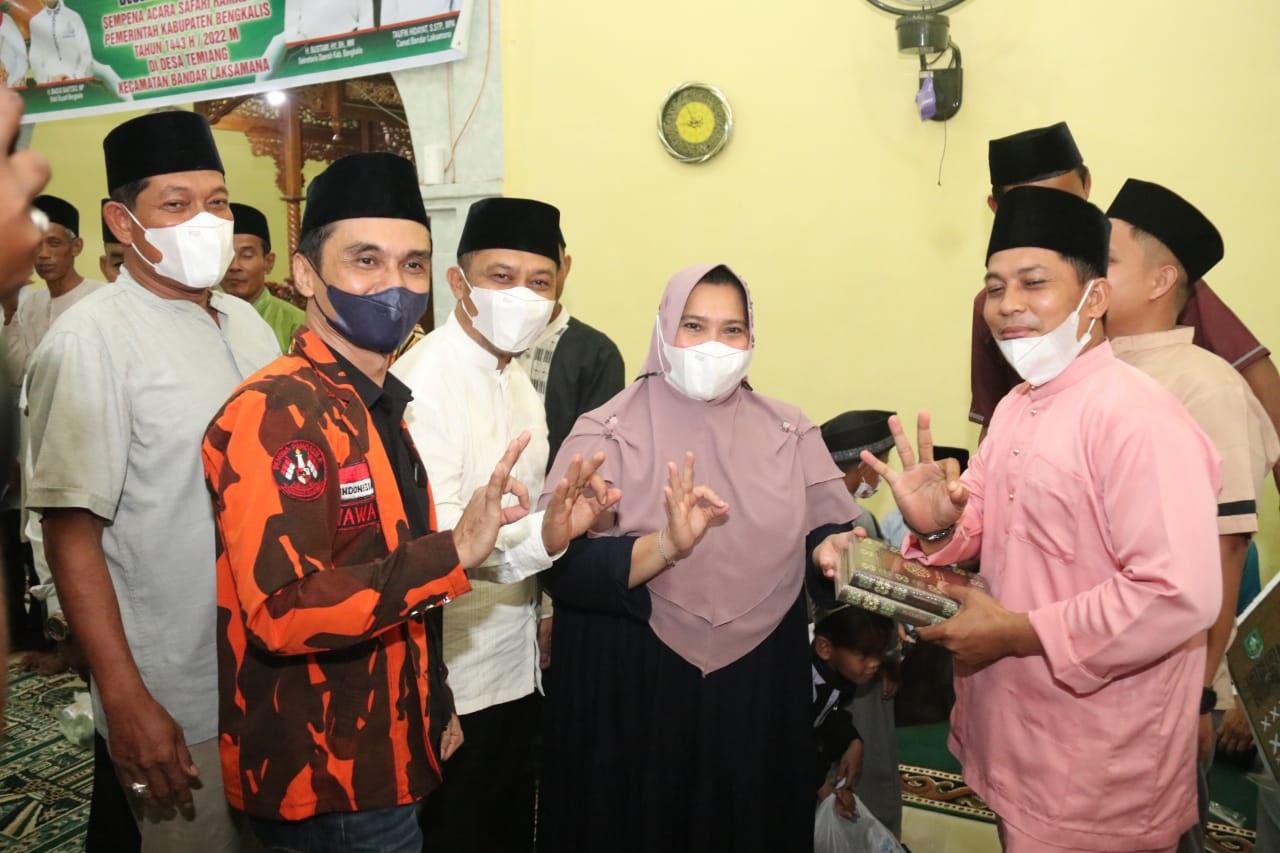 BANDARLAKSAMANA- Guna menjalin silaturahmi sekaligus memanfaatkan momentum ramadhan untuk menyampaikan informasi pembangunan kepada masyarakat, Bupati Bengkalis Kasmarni bersama Wakil Bupati Bengkalis H. Bagus Santoso melaksanakan safari Ramadhan di Masjid Assholihin Desa Temiang, Kecamatan Bandar Laksmana, Senin (10/4/2022).