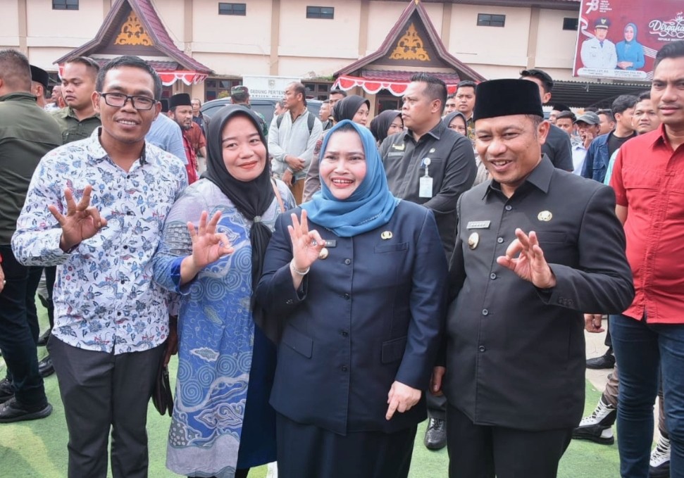 Keterangan Gambar : Bupati dan Wakil Bupati Bengkalis Kasmarni - Bagus Santoso foto bersama dengan perwakilan Kades Purna Bhakti Sapri mantan Kepala Desa Batang Duku dan Istri
