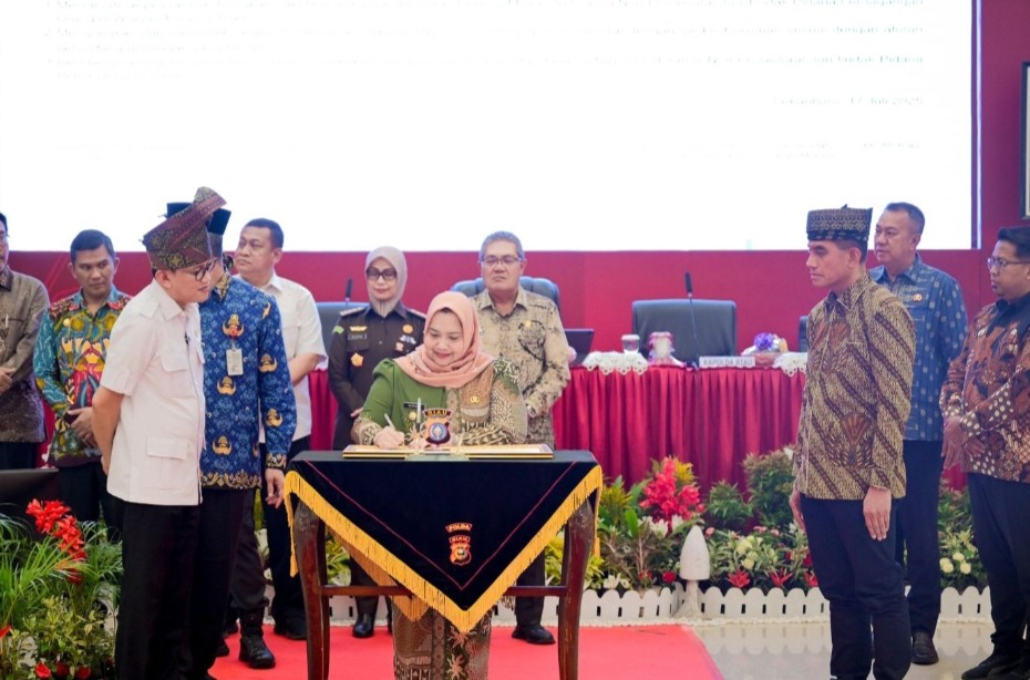 PEKANBARU — Bupati Bengkalis Kasmarni deklarasikan pencegahan dan pemberantasan Tindak Pidana Perdagangan Orang (TPPO) sekaligus Penandatanganan Komitmen Bersama terkait Pencegahan Penempatan Ilegal Pekerja Migran Indonesia dan Pemberantasan TPPO di Aula Polda Riau, Kamis, 17 Juli 2025.
