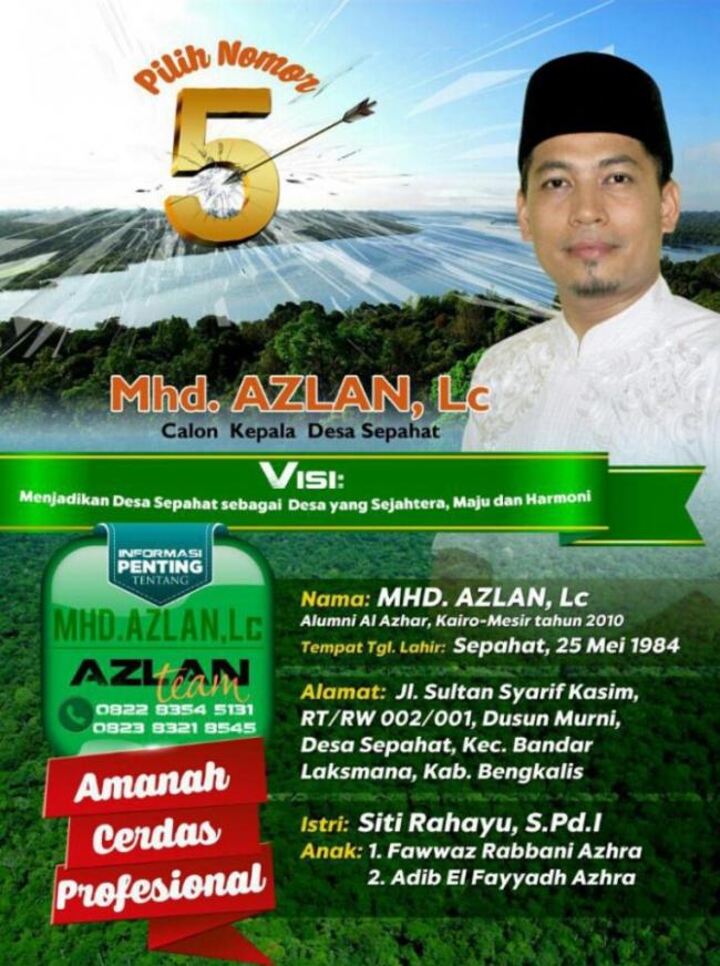 Muhammad. Azlan alumni Universitas Al-Azhar Kairo Mesir memaparkan seandainya Allah mengizinkan beliau menjadi pemimpin baru di Sepahat ia memiliki visi menjadikan Desa Sepahat sebagai desa yang Sejahtera, Maju dan Harmonis