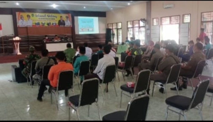 SIAK KECIL- Danramil 07/Bukit Batu Kodim 0303//Bengkalis di Kec. Siak Kecil Kabupaten Bengkalis melaksanakan Komsos Musyawarah tentang PPKM Menjaga Penyebaran Covid 19 di ruang Rapat Aula Kantor Camat Siak Kecil di Desa Lubuk Muda Kec. Siak Kecil Kab. Bengkalis Pukul, 09:00 WIB.Minggu (08/08/2021).