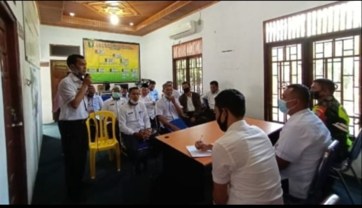 BANDAR LAKSAMANA-Danramil 07/Bukit Batu Kodim 0303//Bengkalis di Kecamatan Bandar Laksamana Kabupaten Bengkalis melaksanakan Komsos terkait tentang Pembahasan Protokol Kesehatan Covid 19 di ruang Rapat Kantor Camat Bandar Laksamana di DesaTenggayun Kecamatan Bandar Laksamana Pukul, 09:00 WIB.Kamis (22/04/2021).