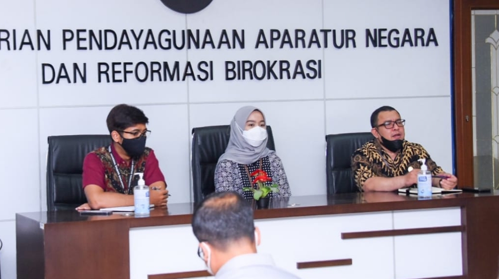 Tibanya rombongan di sambut oleh Perwakilan Asisten Deputi Bidang SDM Aparatur dan Deputi SDM Aparatur Cindy dan Yoga serta Koordinator Humas Kementerian PANRB, Elvan di Ruang Pertemuan lantai satu.