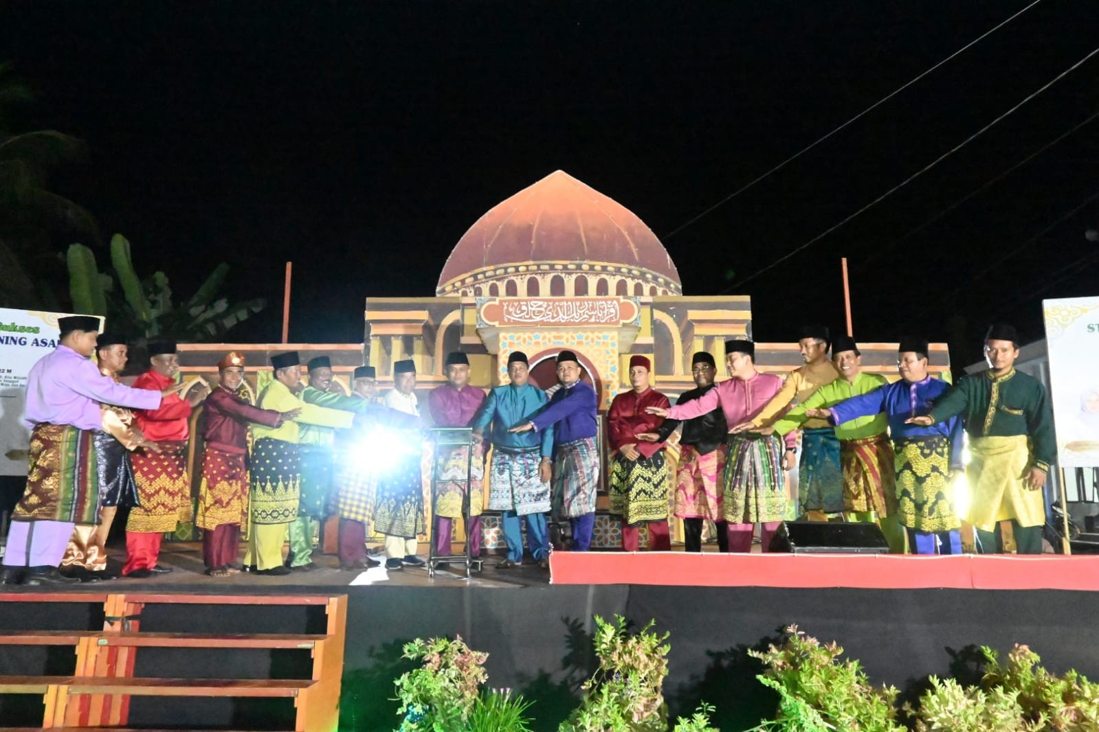 Keterangan Gambar : Penekanan sirine tanda dibukanya STQ ke 9 tingkat Desa Pakning Asal oleh Camat Bukit Batu Acil Esyno, Kepala Desa Pakning Asal Jaswir, Anggota DPRD Bengkalis Zuhandi didampingi sejumlah pejabat dan tokoh masyarakat, Kamis (28/7/2022) malam, halaman Mesjid Al Ilham.