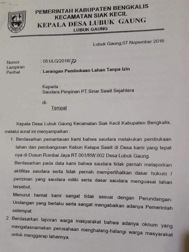 Dalam surat tersebut dikatakan bahwa Pemerintah Desa sudah mendapat laporan serta memantau langsung PT. SSS membuka lahan perkebunan sawit di Dusun Rumbai Jaya RT 001/RW.002 Desa Lubuk Gaung, bahwa Pemerintah Desa meminta PT SSS untuk menghentikan operasionalnya sampai ada legalitas yang benar-benar sah, PT SSS juga dinilai sewenang-wenang menutup jalan masyarakat yang sudah lama ada demi operionalnya.
