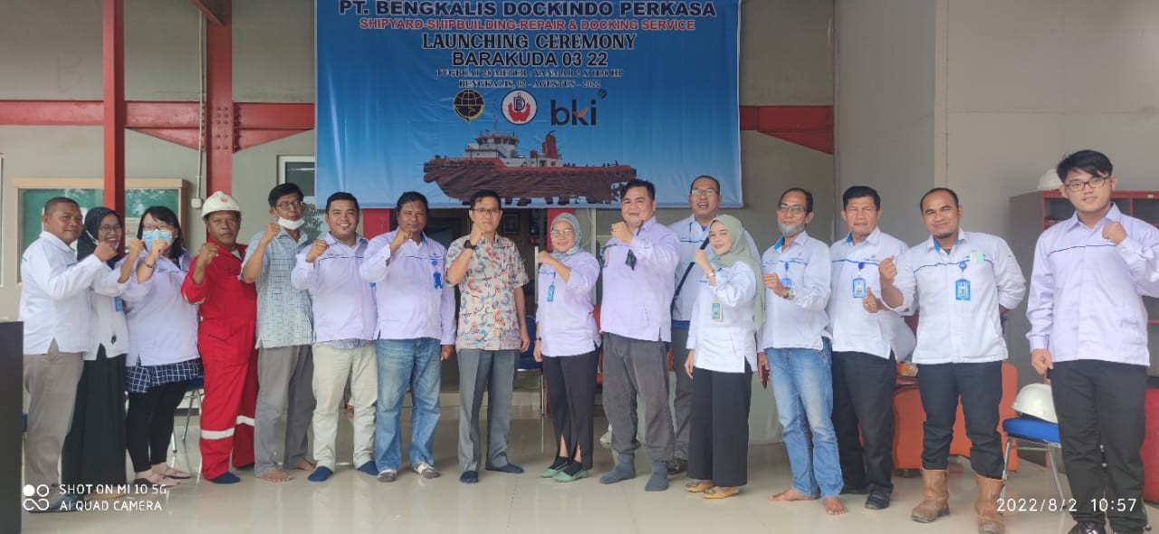 SIAK KECIL - PT Bengkalis Dockindo Perkasa (BDP) yang beroperasi di Desa Sungai Siput Kecamatan Siak Kecil Kabupaten Bengkalis, kembali menggelar Launching Ceremony untuk produksi kapal ke empat yang bernama Tugboat Barakuda 03 22 dengan ukuran 28 meter : Yanmar 2 x 1138 HP, Selasa (2/08/2022).