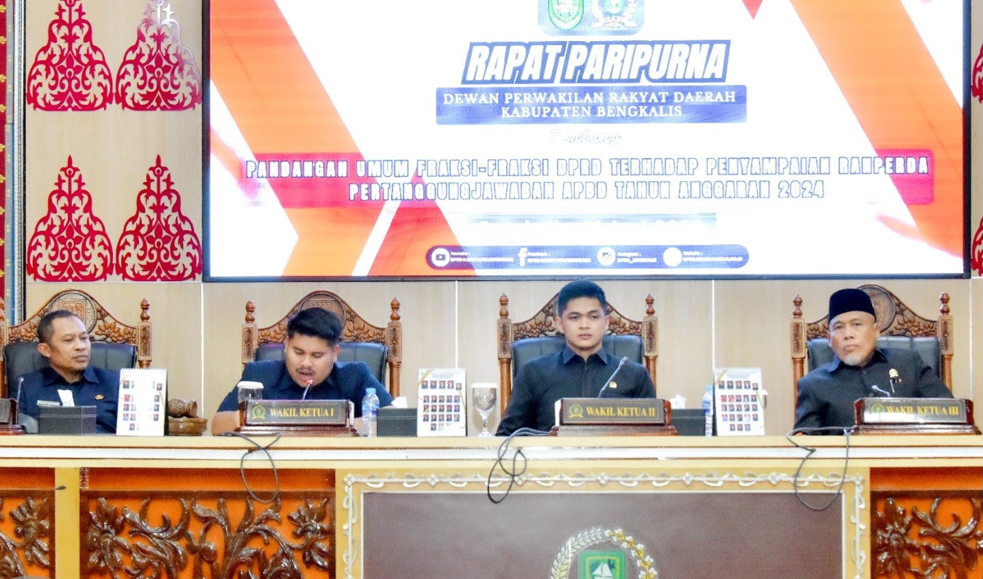 Bengkalis – Usai penyampaian Ranperda tentang Pertanggungjawaban Pelaksanaan APBD Tahun Anggaran 2024, DPRD Kabupaten Bengkalis melanjutkan agenda Rapat Paripurna dengan mendengarkan pandangan umum fraksi-fraksi terhadap Ranperda tersebut, Senin (16/06/2025).