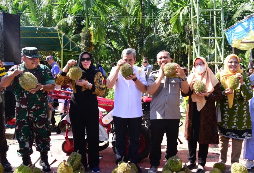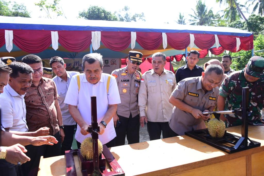 Dikesempatan itu Gubri Syamsuar turut menyerahkan bantuan dari Dinas Tanaman Pangan dan Holtikultura Provinsi Riau berupa alat mesin pertanian (Alsintan), 3.000 batang benih serta sarana produksi untuk 3 gapoktan dan bantuan bahan sarana pengendalian organisme pengganggu tumbuhan (OPT) tanaman durian.