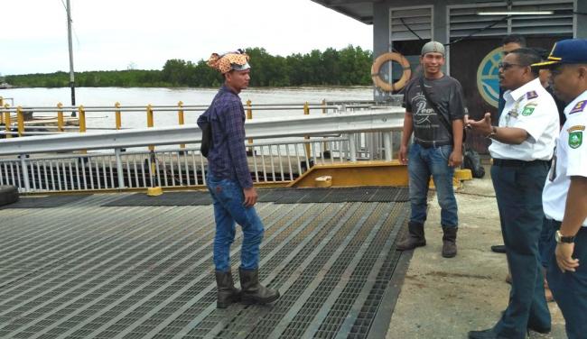 Keterangan Gambar : Kepala Dishubkominfo Bengkalis Jaafar Arief Ketika memantai pelaksanaan perbaikan Dermaga Roro I Air Putih