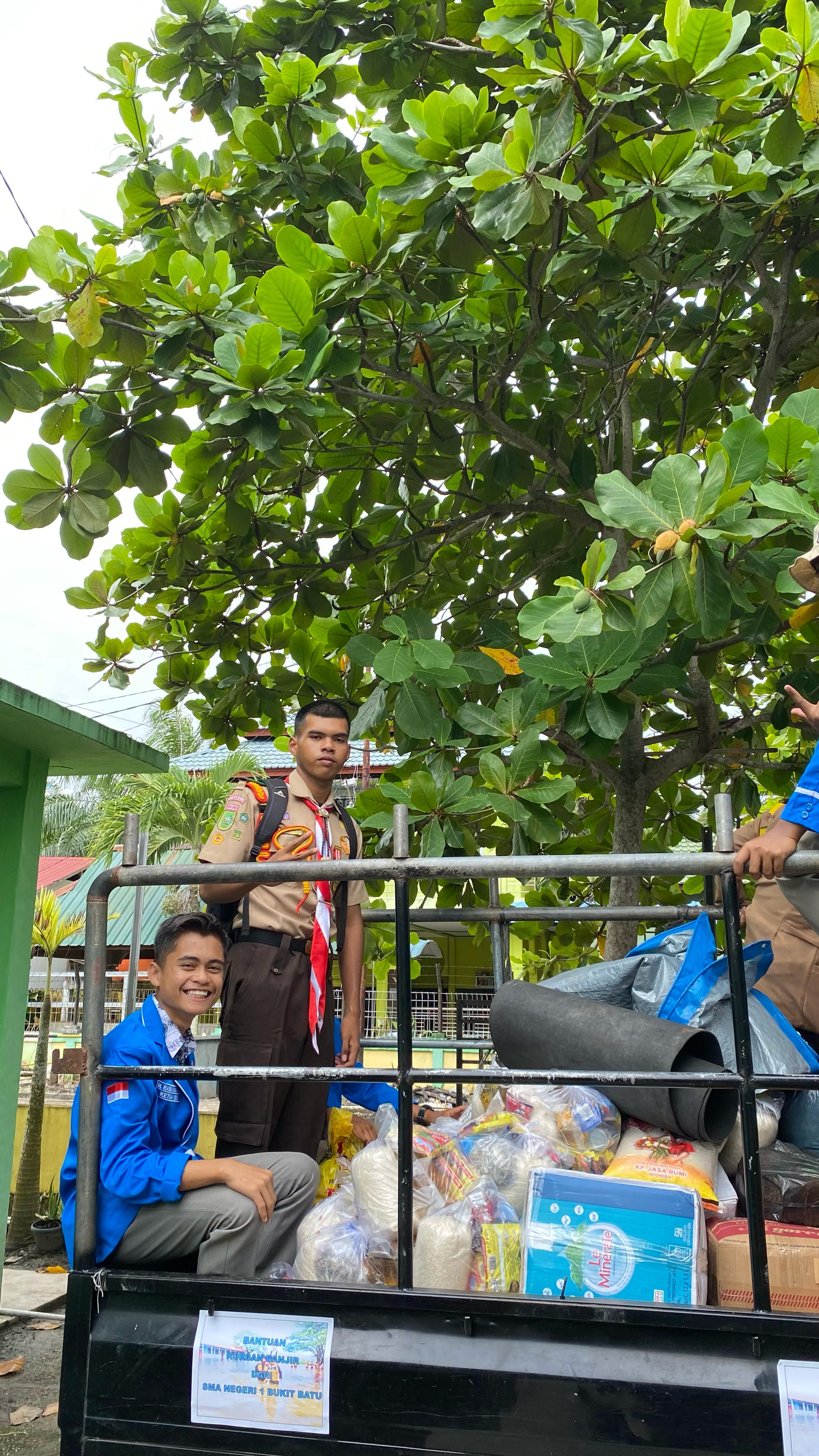 Keterangan Gambar : Penyaluran Bantuan Korban Banjir, oleh Imka Buba, Osis dan Pramuka SMAN 1 Bukit Batu