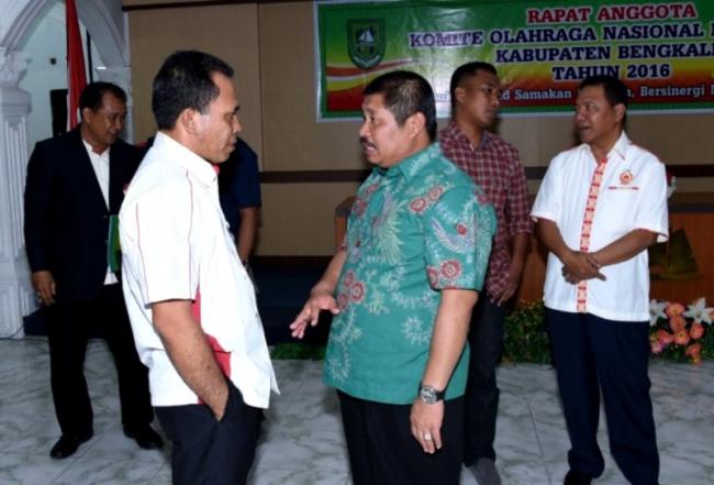 Keterangan Gambar : Bupati Bengkalis Amril Mukminin dan Ketua KONI Kabupaten Bengkalis Syaukani AlKarim berbincang-bincang saat Rakor KONI beberapa waktu lalu
