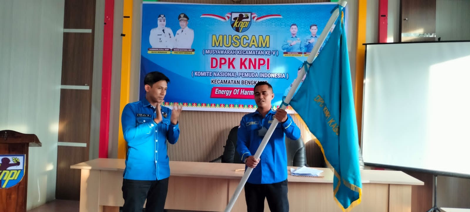 Keterangan Gambar : Joko saat menerima bendera petaka DPK KNPI Kecamatan Bengkalis dari Sekretaris DPD KNPI Bengkalis Marvim Samudera