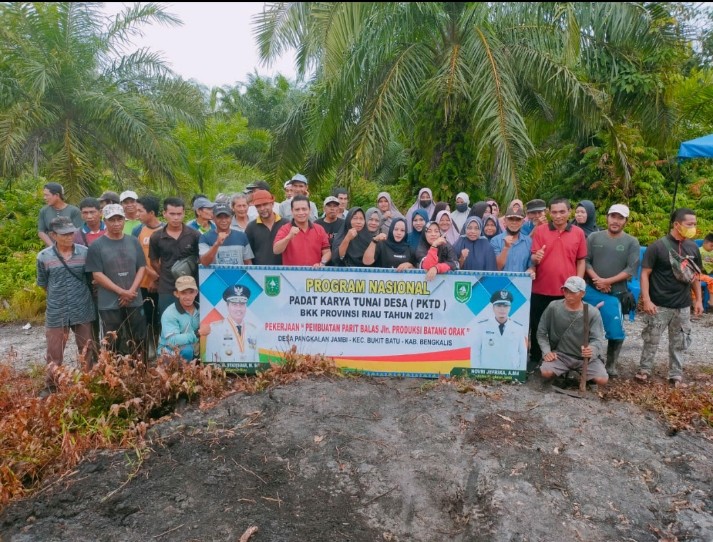 BUKITBATU- Pemerintah Desa Pangkalan Jambi Kecamatan Bukit Batu Kabupaten Bengkalis melaksanakan Program Padat Karya Tunai Desa (PKTD) Tahun 2021. Dengan tujuan mampu memulihkan ekonomi masyarakat di masa pendemi Covid-19.