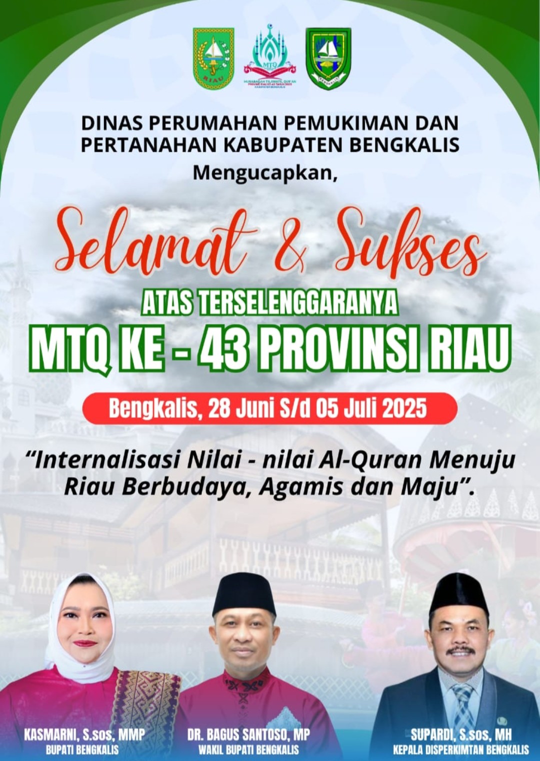 BENGKALIS — Kepala Dinas Perumahan, Permukiman, dan Pertanahan (Disperkimtan) Kabupaten Bengkalis, Supardi, S.Sos., MH, mengucapkan selamat dan sukses atas pelaksanaan Musabaqah Tilawatil Qur’an (MTQ) ke-43 Tingkat Provinsi Riau yang digelar di Kabupaten Bengkalis pada 28 Juni hingga 5 Juli 2025.