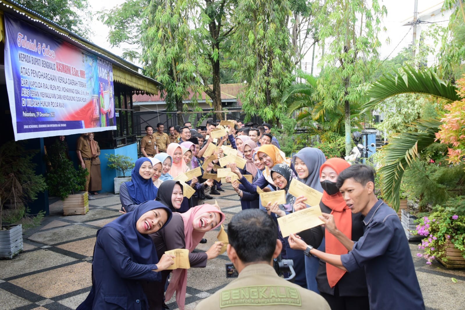 Keterangan Gambar : Sejumlah tenaga honor dan kontrak di lingkungan Diskominfotik Bengkalis bersuka cita setelah menerima SK tahun 2023