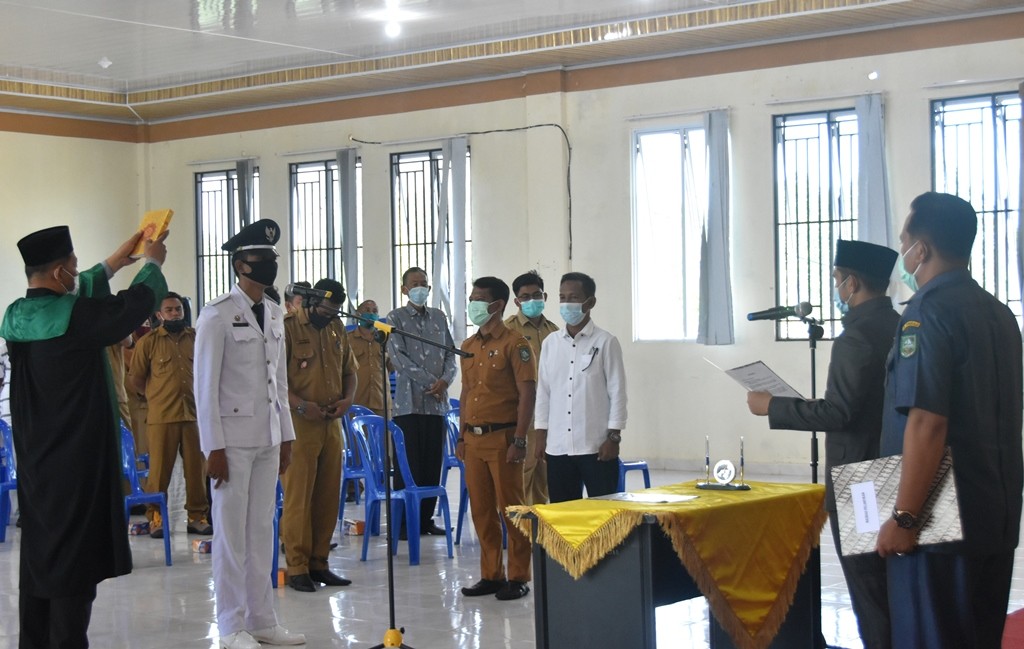 Keterangan Gambar : Teks foto: Camat Bukit Batu Saat Melantik dan Mengambil Sumpah Pj. Kades Sejangat, Senin 22 Maret 2021