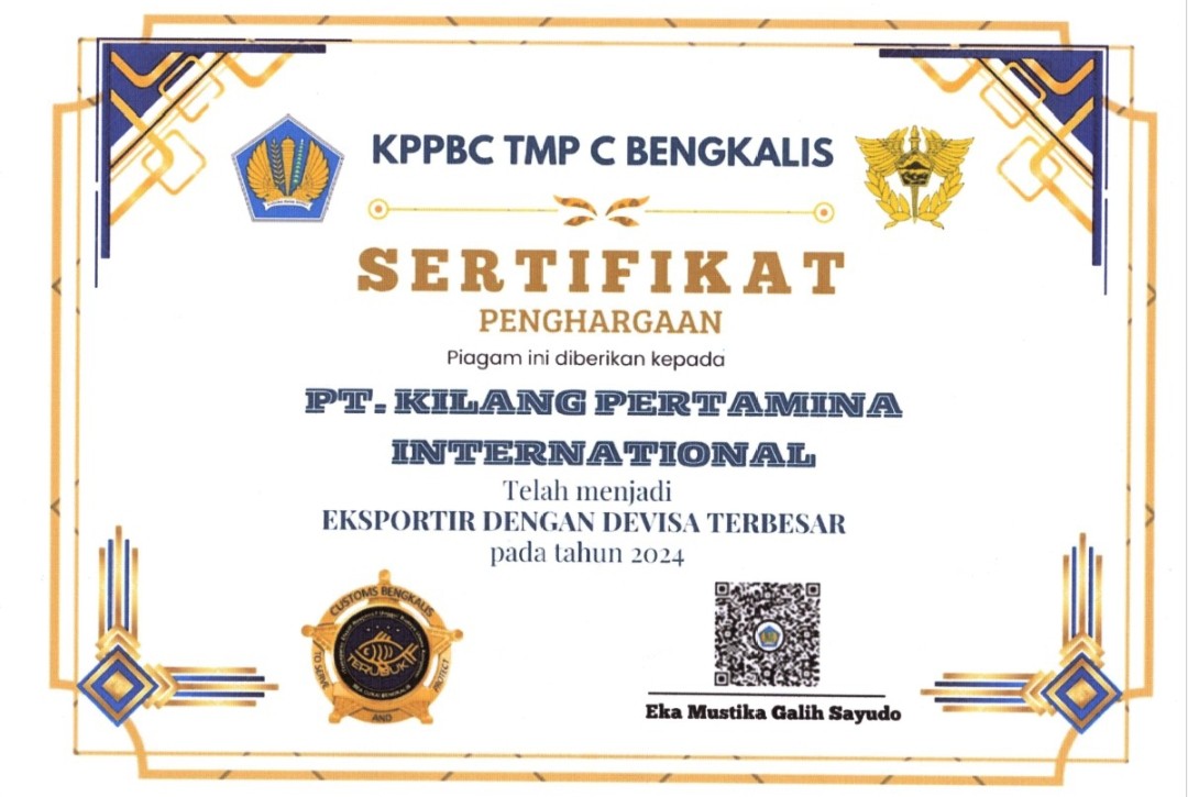 Penghargaan prestisius ini diserahkan langsung oleh Eka Mustika Galih Sayudo, Kepala Kantor Bea dan Cukai Bengkalis, sebagai bentuk apresiasi atas kontribusi nyata KPI RU II Sungai Pakning dalam meningkatkan penerimaan devisa negara melalui aktivitas ekspor produk kilang.