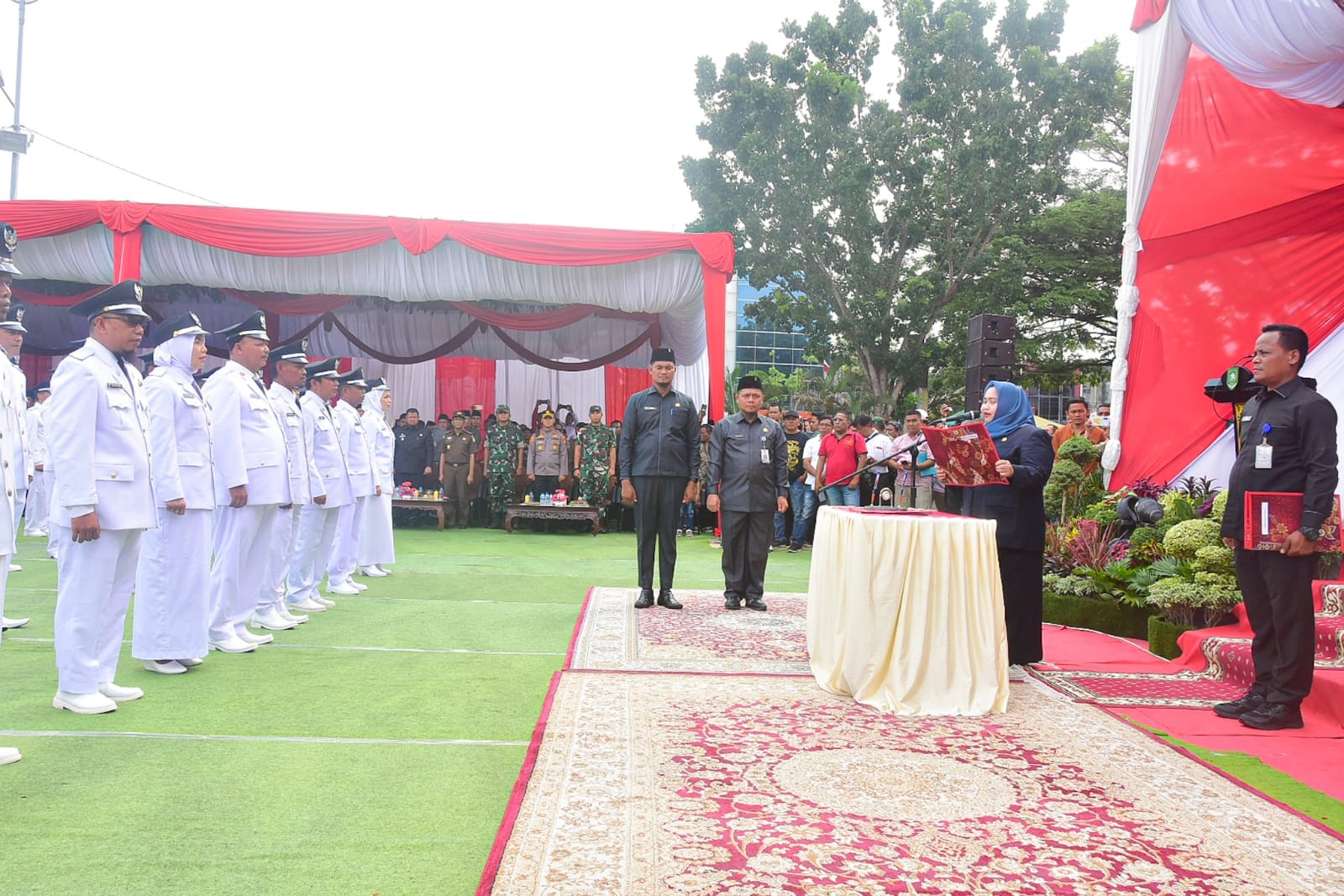 MANDAU - Bupati Bengkalis Kasmarni melantik dan mengambil sumpah pelantikan Penjabat (Pj) Kepala Desa (Kades) se-Kabupaten Bengkalis, Jum'at, 1 September 2023 di halaman Kantor Camat Mandau.